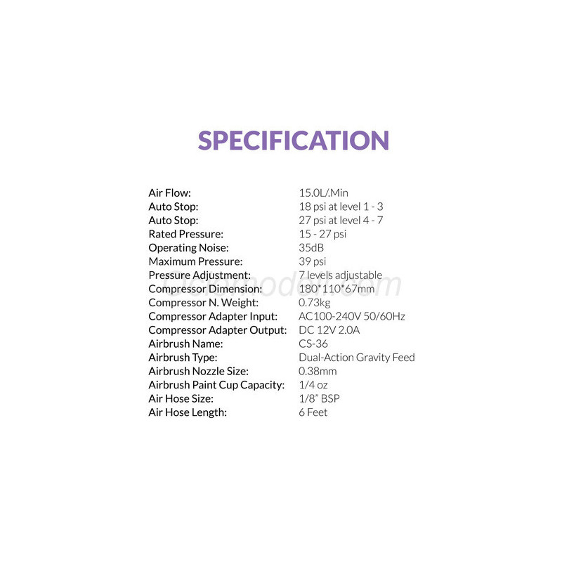 - Pequeño pero potente: A pesar de su tamaño compacto, el compresor cuenta con 7 niveles de presión y una salida de presión de aire máxima de 27 PSI, lo que le da la versatilidad para manejar todas sus necesidades de modelado con aerógrafo.