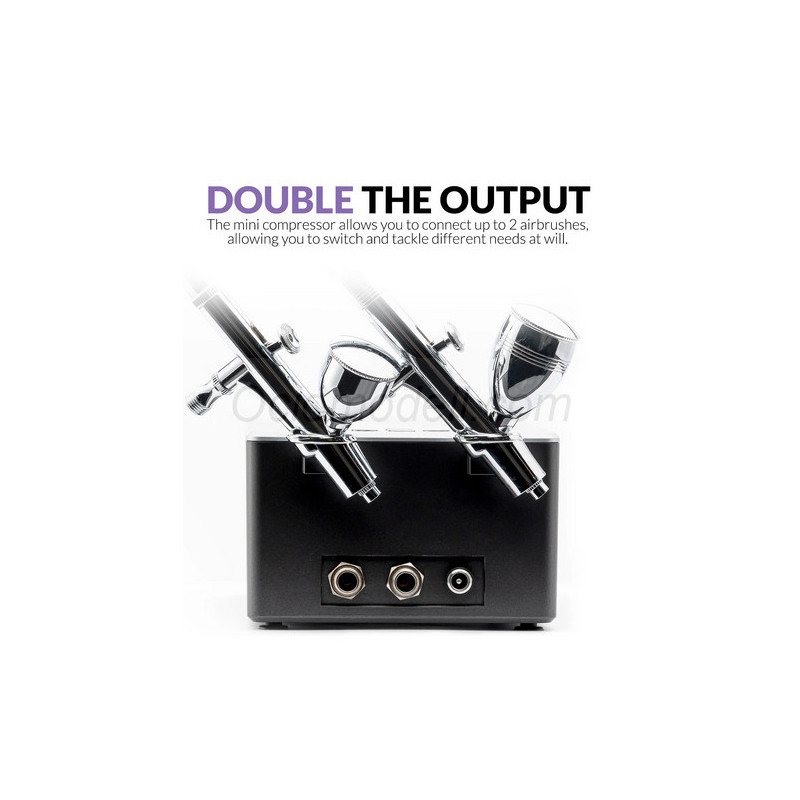 - Doble salida: Conecte hasta dos aerógrafos simultáneamente con este mini compresor, lo que le permite cambiar entre herramientas sin esfuerzo y adaptarse a los diferentes requisitos del proyecto con facilidad.