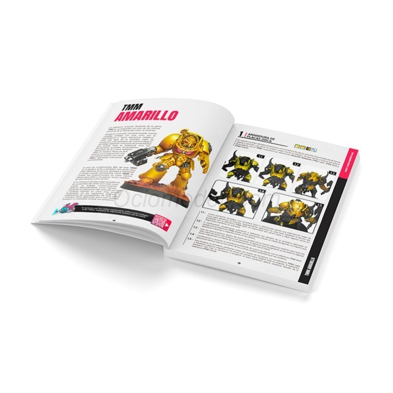Incluye teoría del color aplicada al metal, consejos técnicos, técnicas de pincel y aerógrafo, un recorrido completo por las familias cromáticas de la gama TMM, contenidos avanzados y un paso a paso final de la figura Elysia.